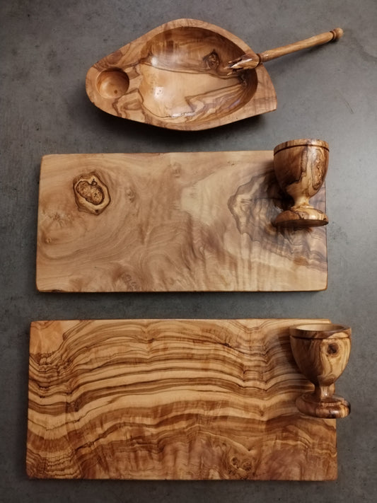 6 Teilges Set - 2 x Frühstücksbretter + 2 x Eierbecher + 1 x Oliven- / Antipastipicker + 1 x Schale für Oliven, Antipasti aus Olivenholz